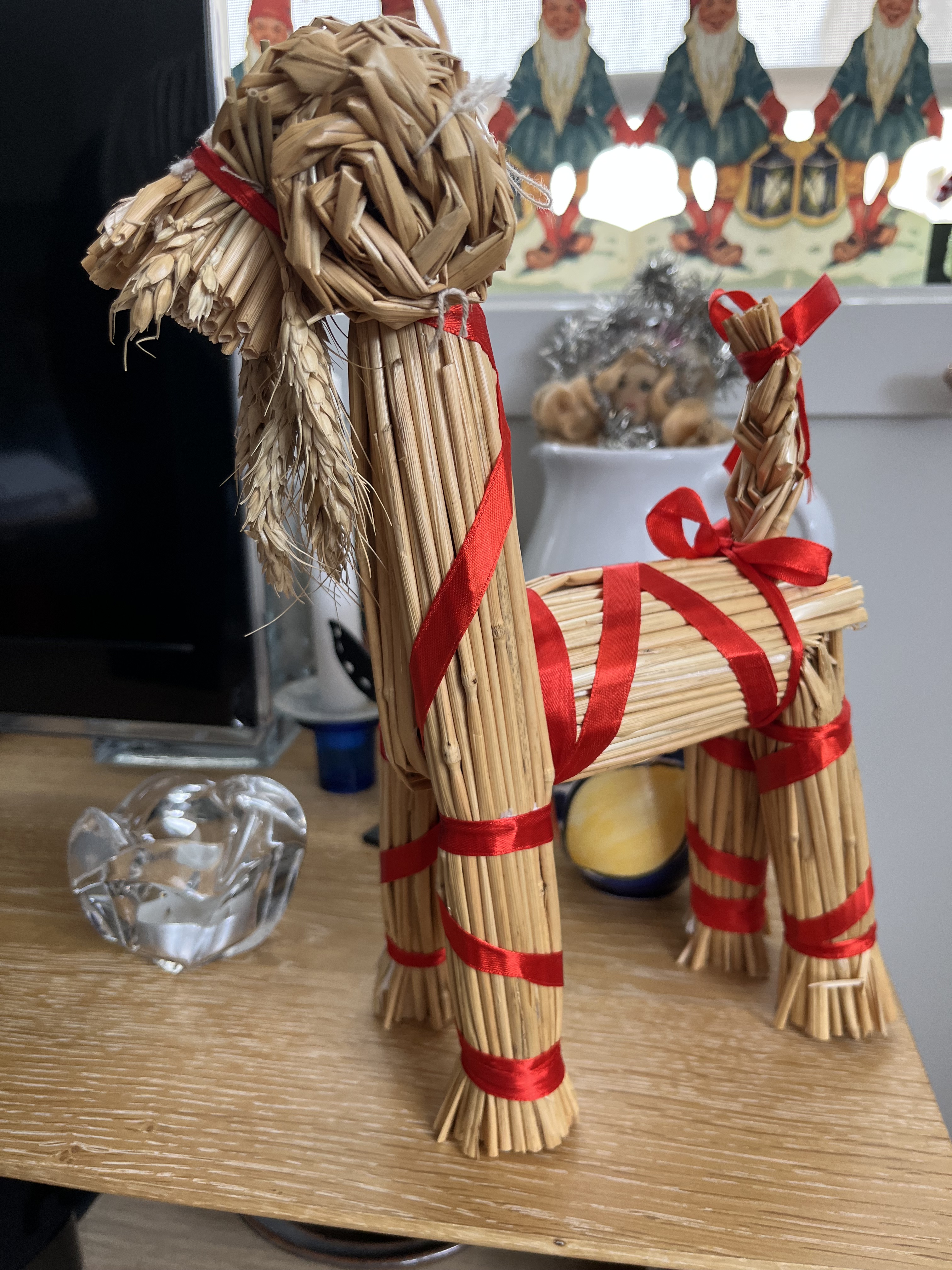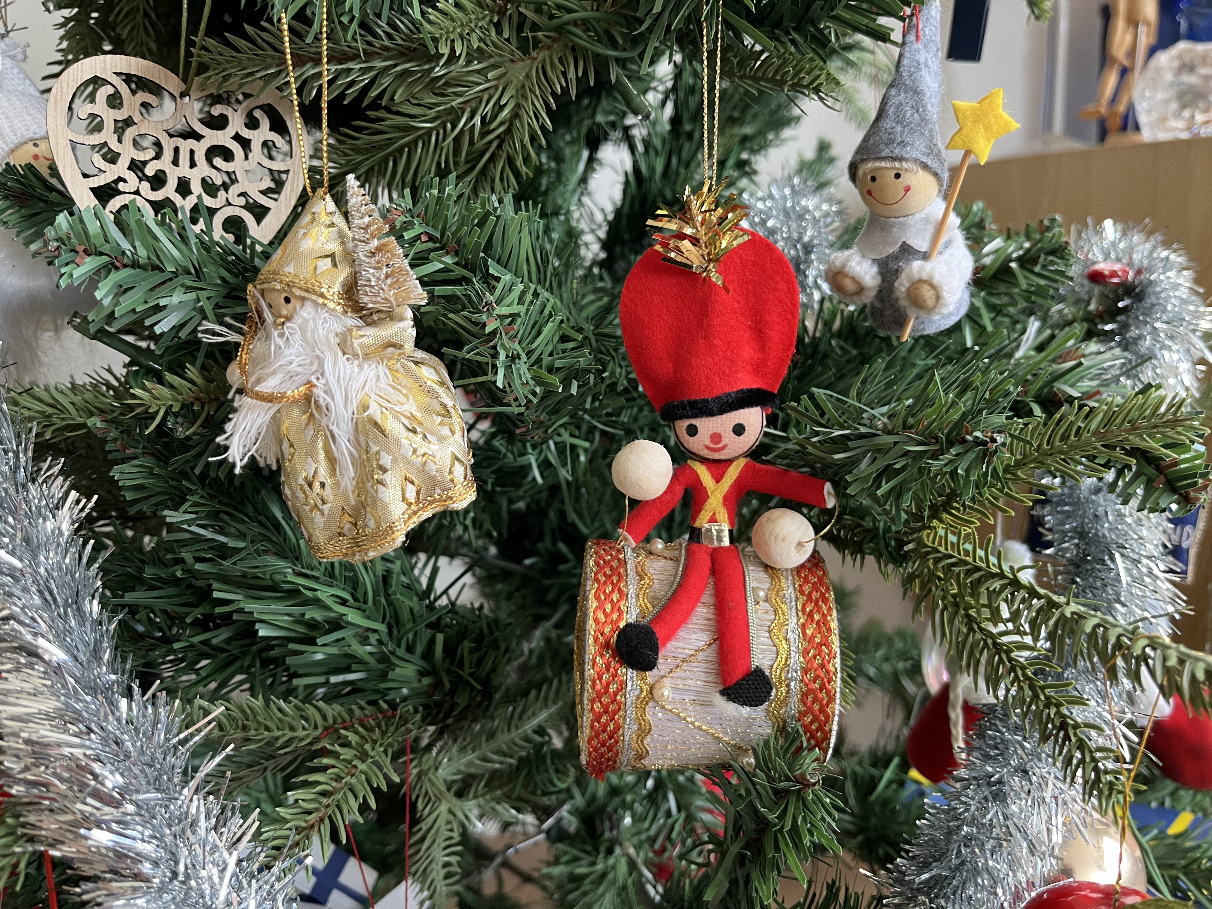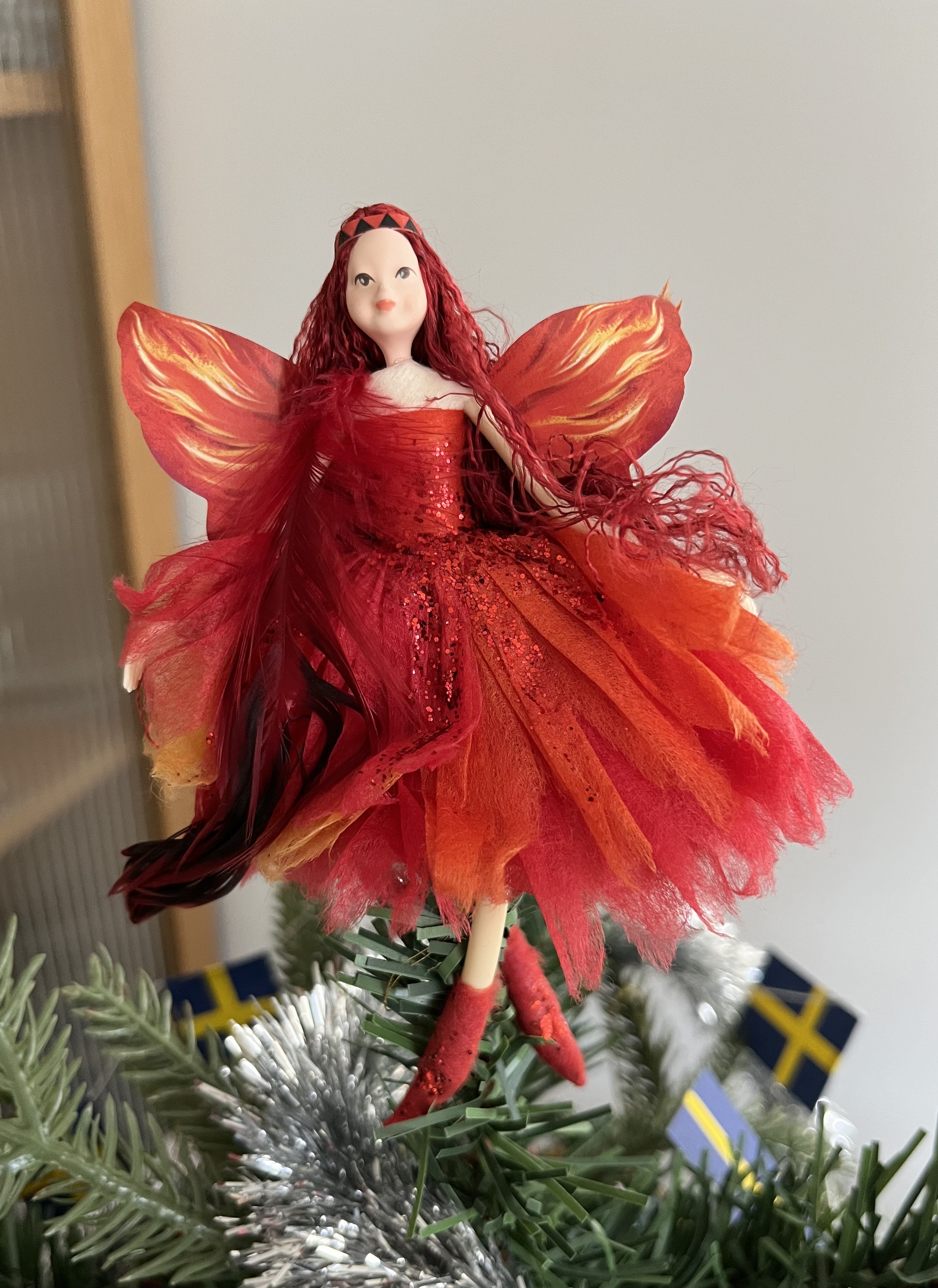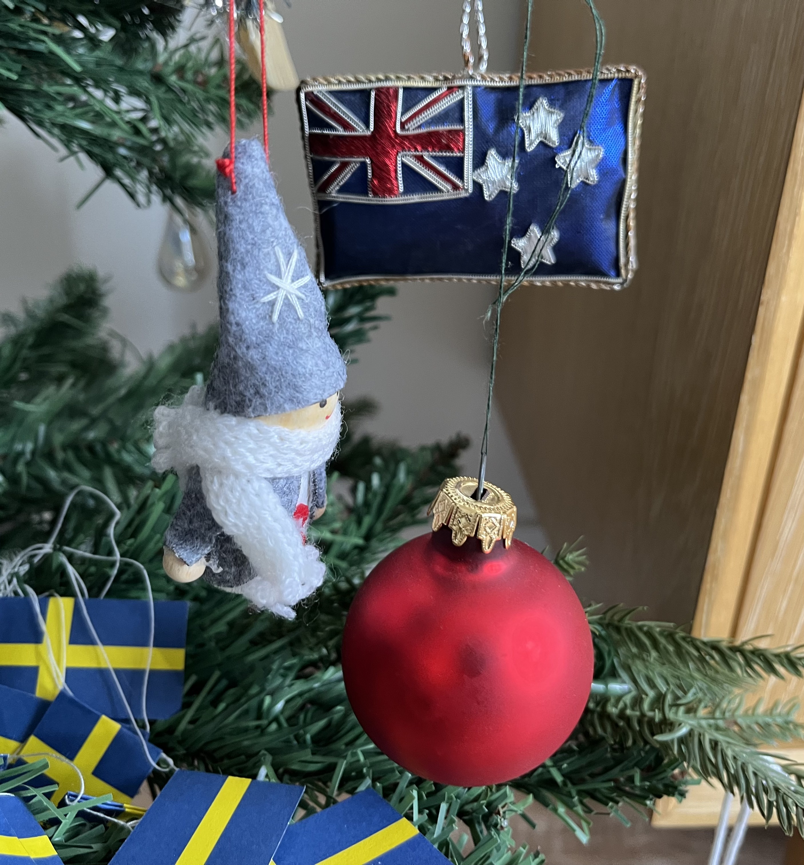 On Saturday we put up our tree, bringing out all the old favourites such as the little drummer boy, bought in Paris in 1970, the silver maple leaf, a gift from one of my nieces, lots of little people, a few baubles, a yellow crested bird from Australia, flags of several nations, and the pohutukawa flower fairy on the top of the tree. Our julbock is also out, watching over all the festivities.