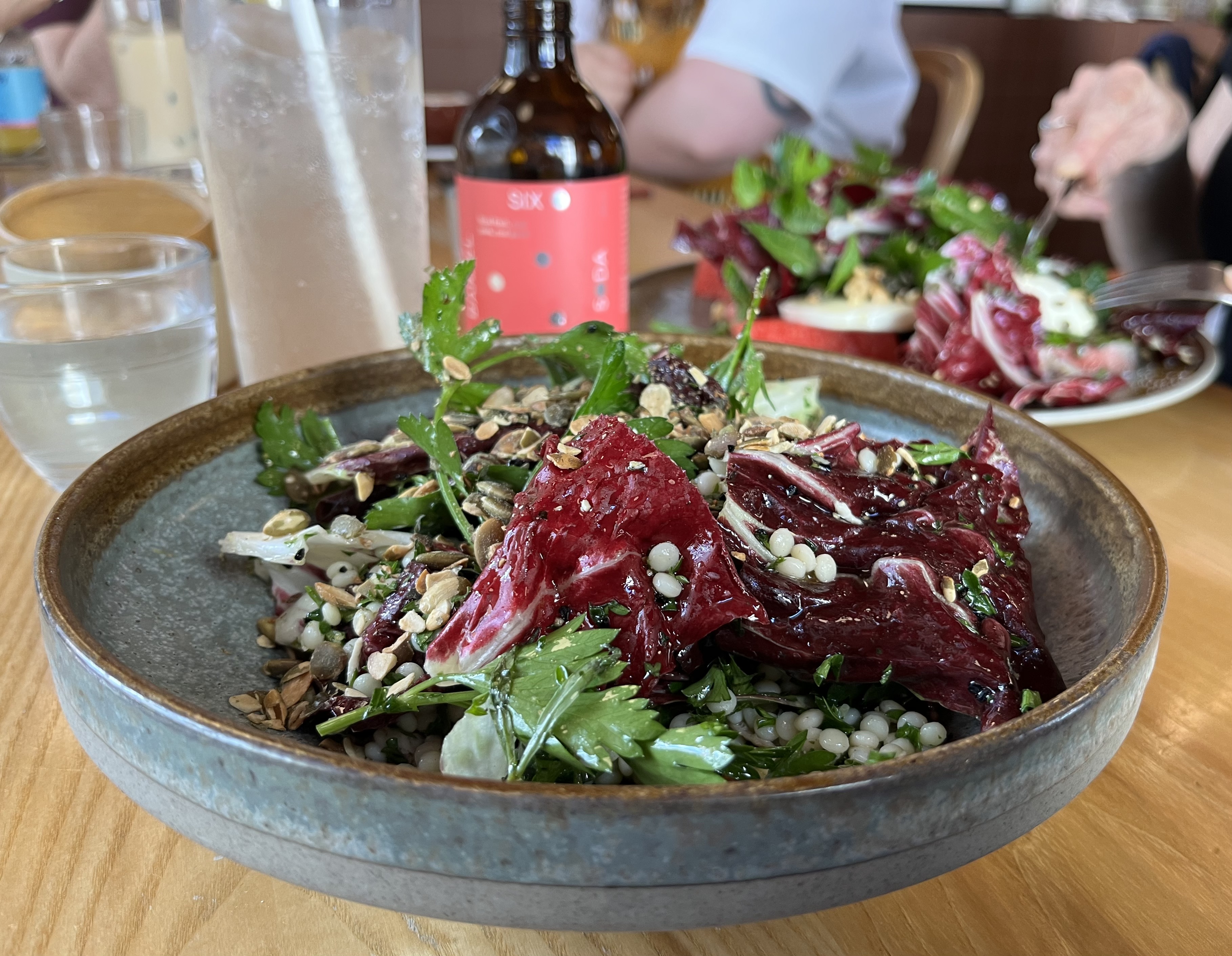 I went to favourite The Bond Street Deli on Friday for lunch and one of their excellent bagels, this time going for the egg salad for a change. Once again, there was a massive amount of filling. Today I met a friend for lunch at August, and enjoyed a pearl couscous and chicken salad with tons of fresh herbs, washed down with Six Barrel Soda raspberry and and lemon, while my friend enjoyed a watermelon and mozzarella salad, with lots of mint.