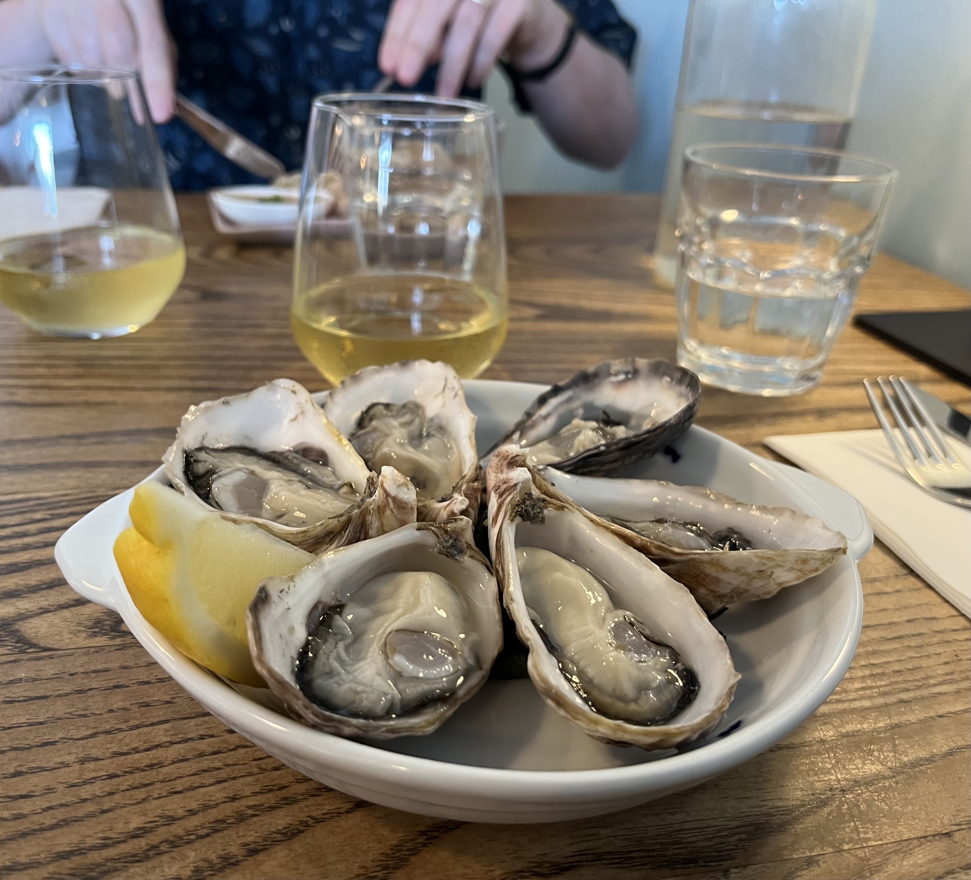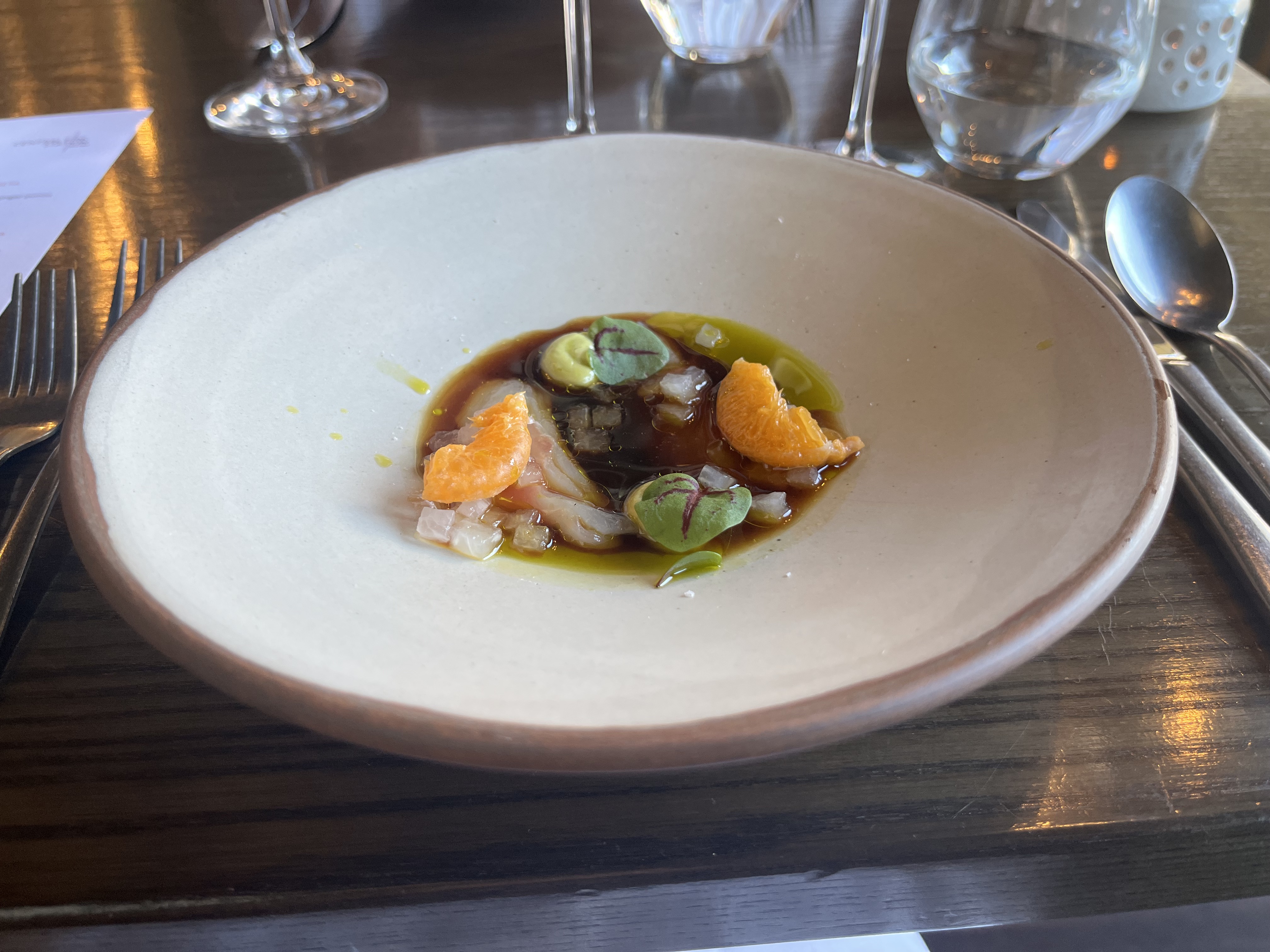 At the end of our short trip, we had another fine dining experience at Central Fire Station Bistro. We were welcomed with a glass of sparkling wine, and decided to go for the Trust the Chef menu, which started with some lovely sourdough bread and butter and snacks of tempura oysters and little puffs with cheese and ham. As Karl does not eat oysters, I had to eat both of them – what a treat that was! I can still taste them.