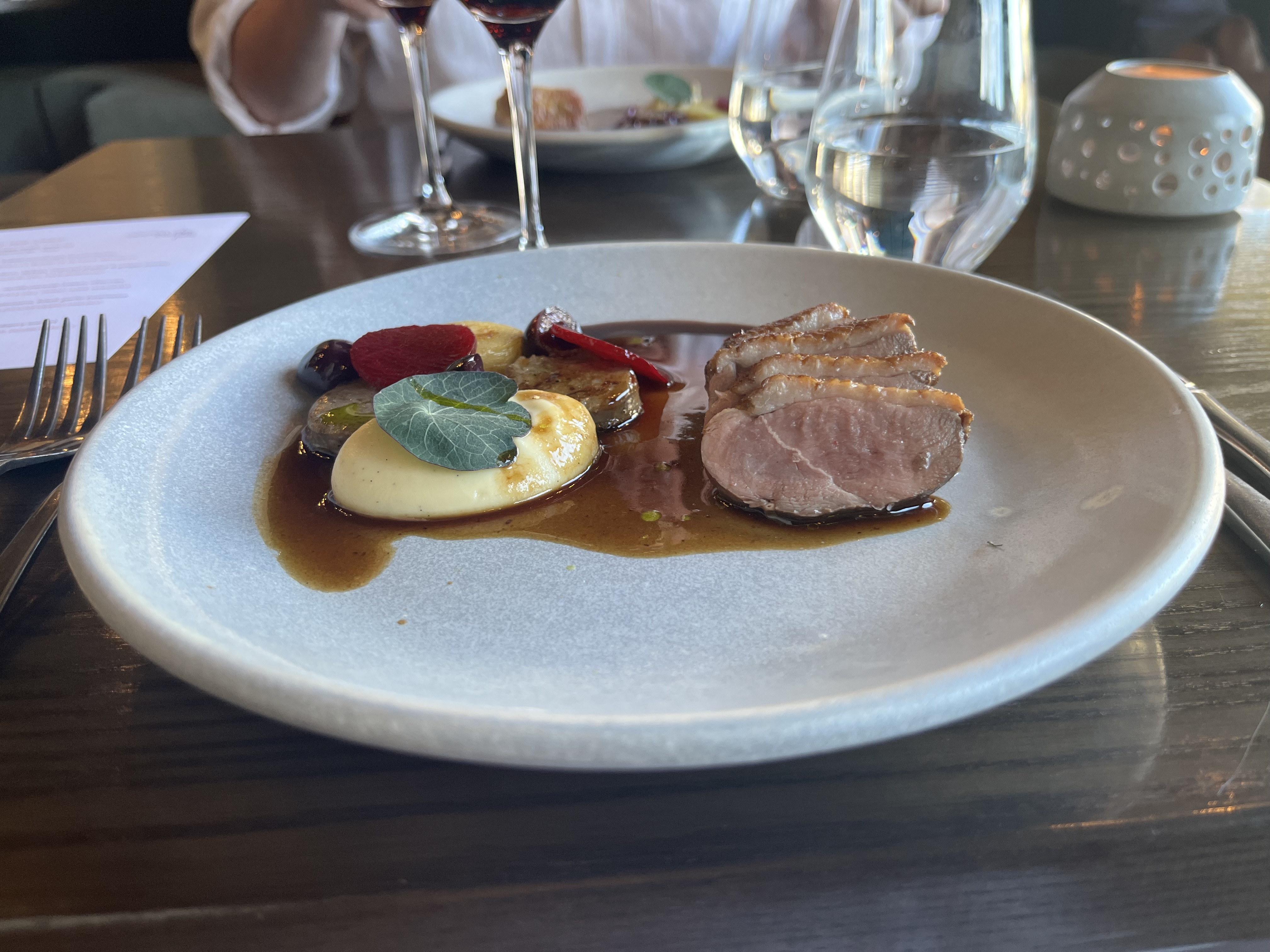 We then had a raw fish dish with avocado, mandarin, daikon, shallot and ginger ponzu. The citrus was a wonderful burst of contrast to everything else that just worked well. The excellent sauvignon blanc was a good match. We then had duck breast served with chicken sausage and vanilla parsnip cream and cherries, another beautiful dish, served with a local pinot noir.
