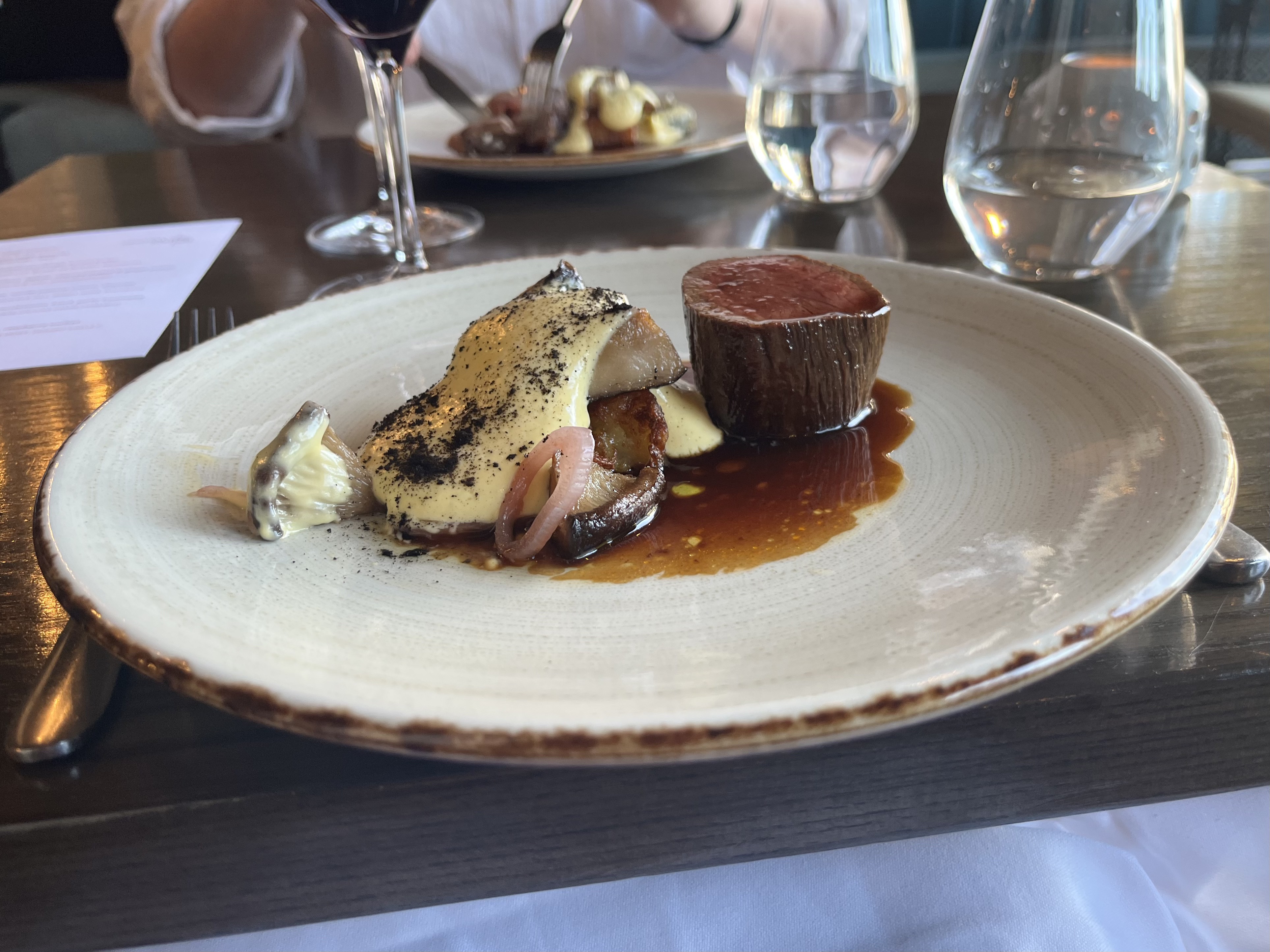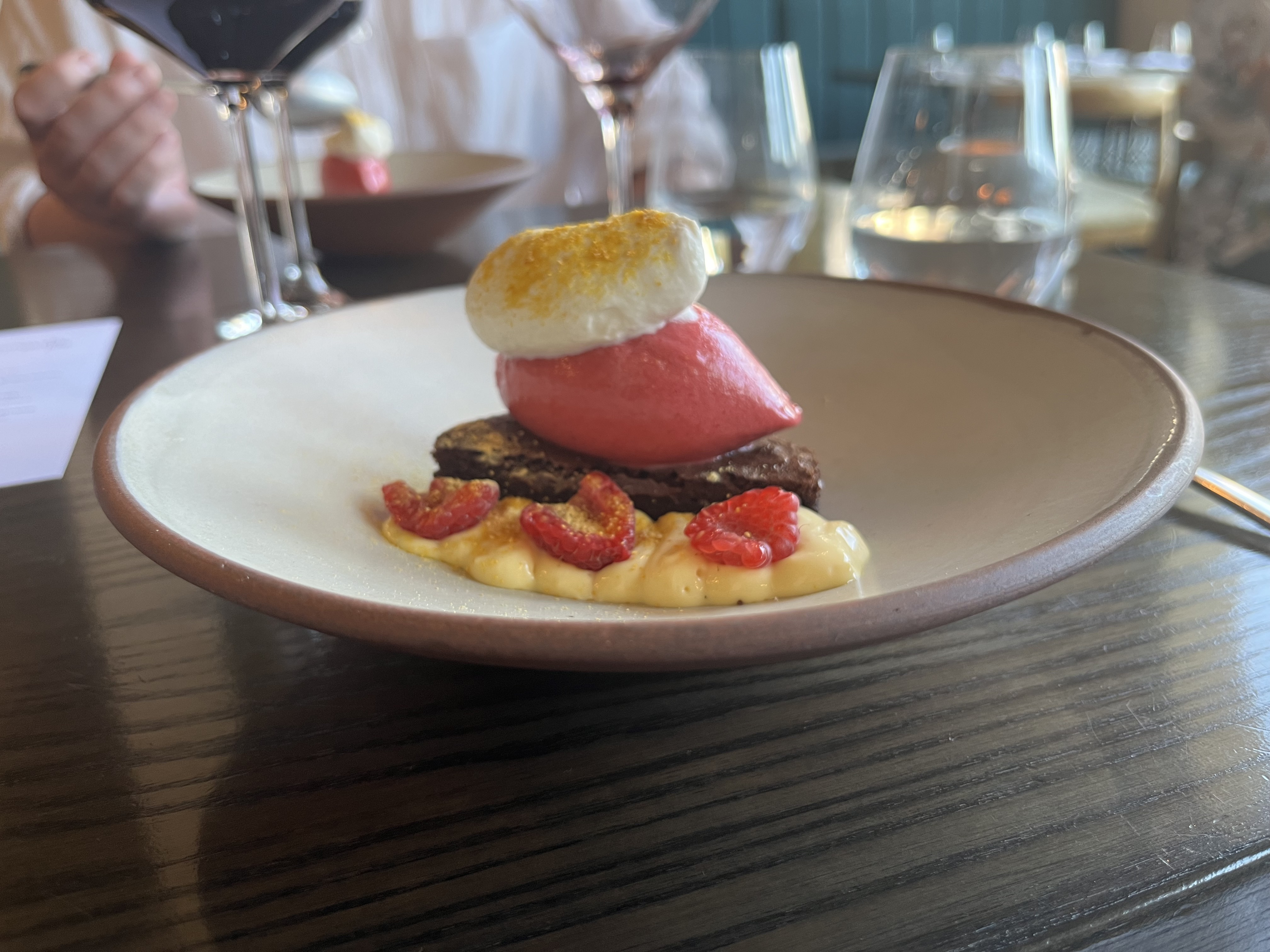 The main dish was beef fillet with rosti potato, mushrooms and black garlic mayonnaise which was another flavour bomb (as they say) with perfectly cooked beef. This came with a wine from Jenny Dobson (it was the one called ‘Doris’). Dessert was the dark chocolate cake with a sherry cream and raspberry sorbet. This was just so good, chocolate and raspberries go so well together, and served with port.
