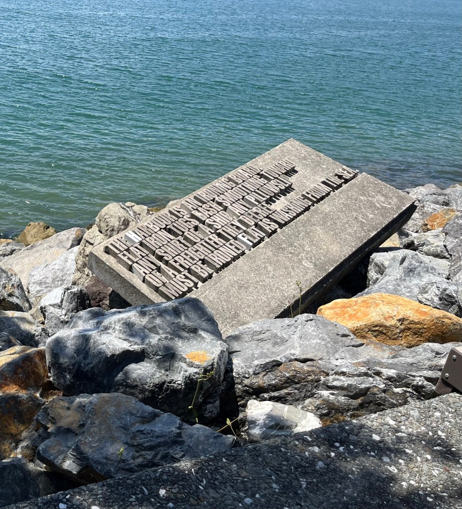 At lunch time on Friday, I went for a walk along the waterfront as it is nice to do on a sunny day (or actually any time…but the good weather helps). I was reminded of the Wellington Writers’ Walk, a series of plaques with poetry celebrating the city. This extract is from Denis Glover’s 1977 Come High Water. It is nice just to stop, read the words, and stare out of the water.