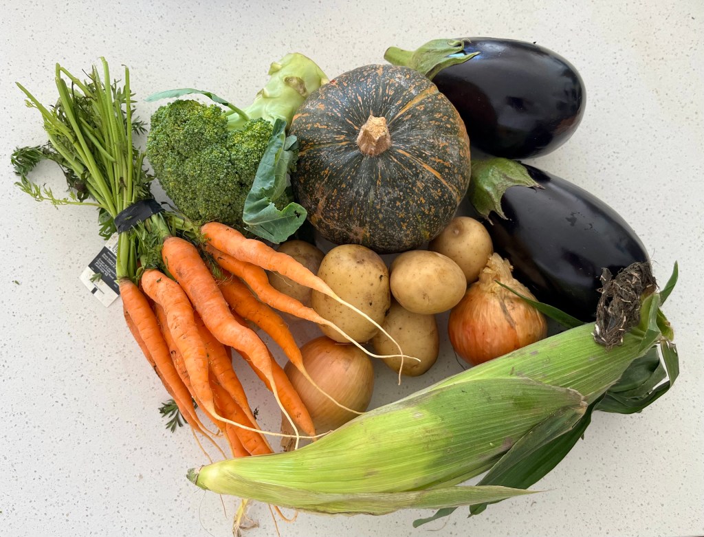 We got a Wonky Box this week, and apart from the dreaded pumpkin, there were potatoes, onions, sweetcorn (x 2), a bunch of mini carrots, aubergines (eggplant), green beans, some not very fresh broccoli and a bunch of basil that rotted as I looked at it. As you can tell, I am slightly going off this delivery scheme, and think the quality and variety has gone down in the past year.