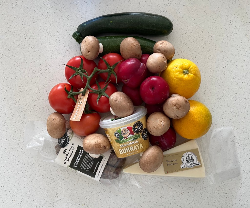 Anyway, we topped this off with blueberries and raspberries, plums, mushrooms (to have with pork filet), tomatoes, courgettes (zucchini), a couple of oranges, tomatoes, burrata, pecorino romano, some pink peppercorn and fennel salami along with some lamb mince to make moussaka, using those aubergines.