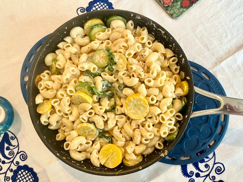 I made a rather good salad on Saturday to have with the fish, home made tartare sauce and potatoes from cucumber, radishes, sweetcorn and lots of dill and a simple dressing. I also made courgettes pasta using the green and yellow ones I bought the week before, which was excellent (I made the mistake on taking the picture with a light on in the kitchen).