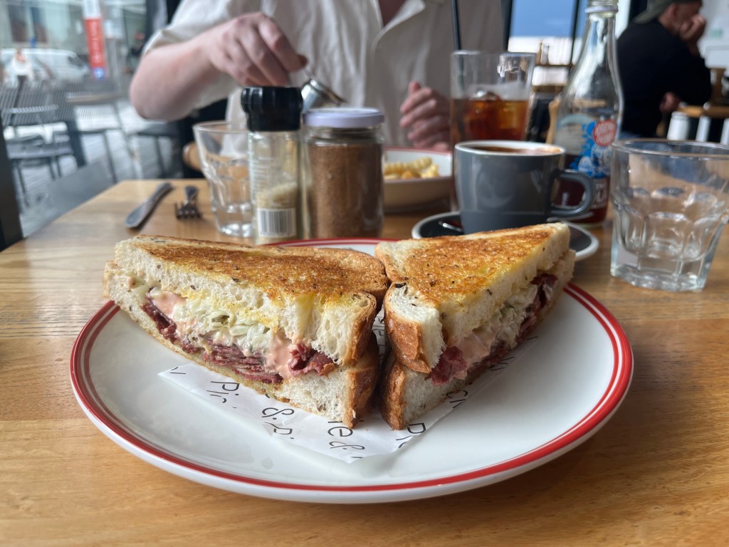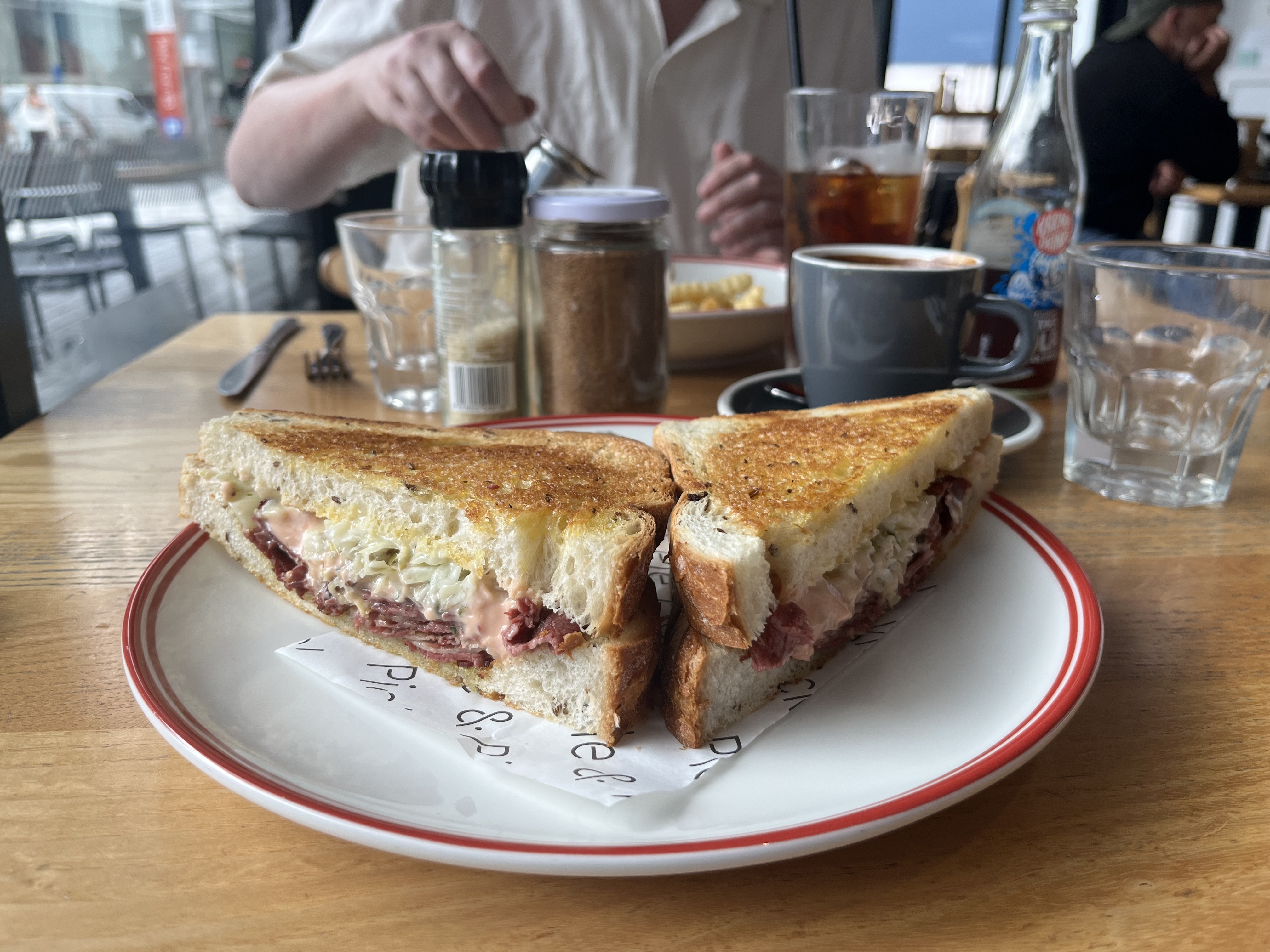 I came out of Pilates on Wednesday and saw a familiar figure…that of my husband. So we went to have lunch together at Pickle and Pie. I opted for toasted reuben on rye bread and Karl had the brisket, pilsner and smoked cheese pie served with gravy and crinkle chips (or fries if you must). A lovely treat for us both.