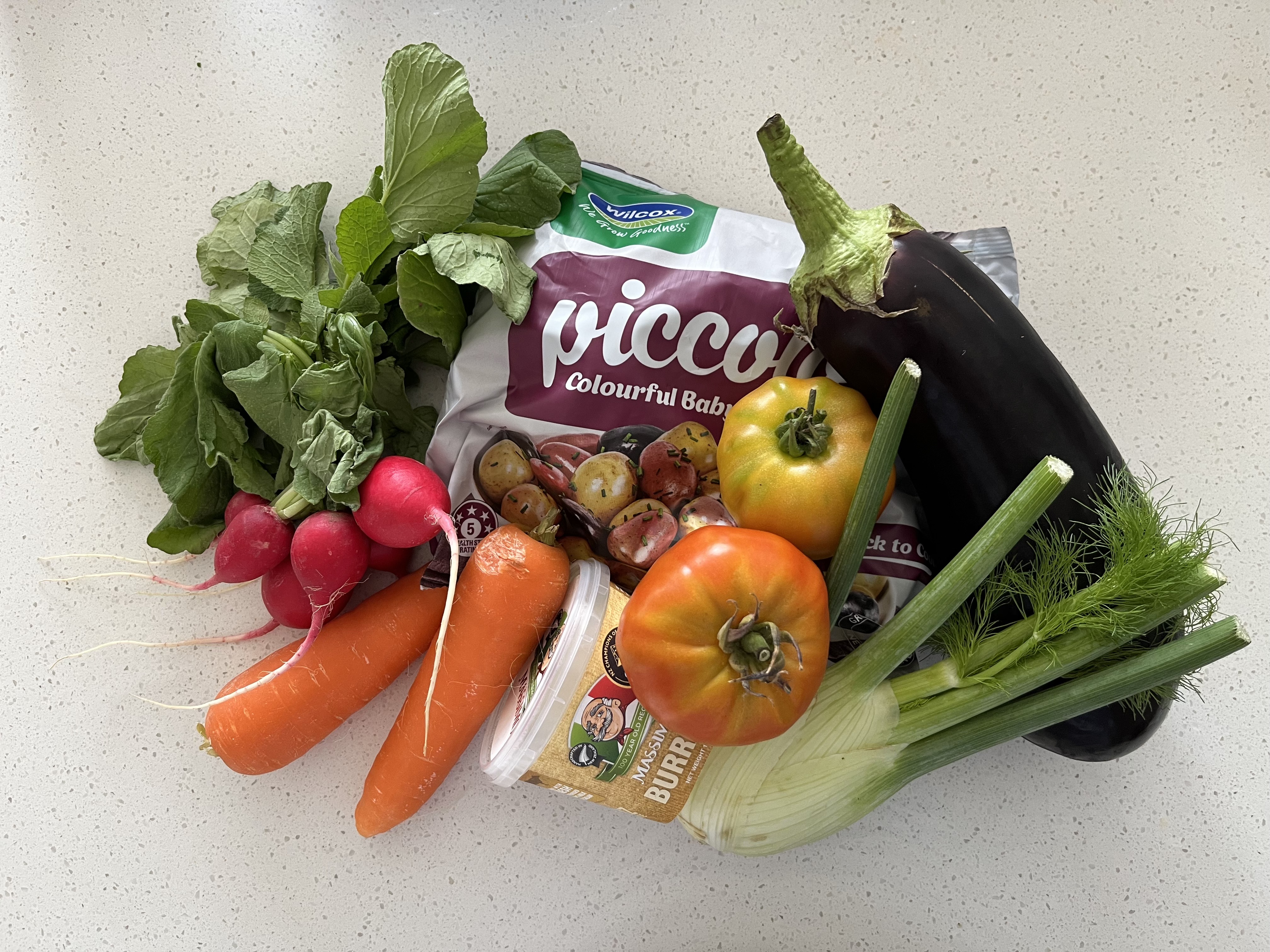 No Wonky Box again this week…getting too close to The Big Trip. I picked up some of these little colourful potatoes. an aubergine to make pasta alla norma, a fennel bulb, a bunch of radishes, carrots and some heirloom tomatoes and burrata. There were more raspberries and blueberries, which are just so good just now, sausages, lamb mince and some lovely tarakihi (a fish) we had for Saturday’s dinner.