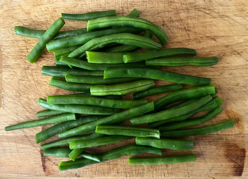 Preheat the oven to 200C. Trim the green beans, and place on a parchment lined baking tray with the tomatoes and spring onions (I didn’t have any but am not that keen anyway). Drizzle over half of the tomato anchovy oil, toss to combine and place in the oven for 12–13 minutes, until the beans and tomatoes are starting to soften and taking on a little colour.