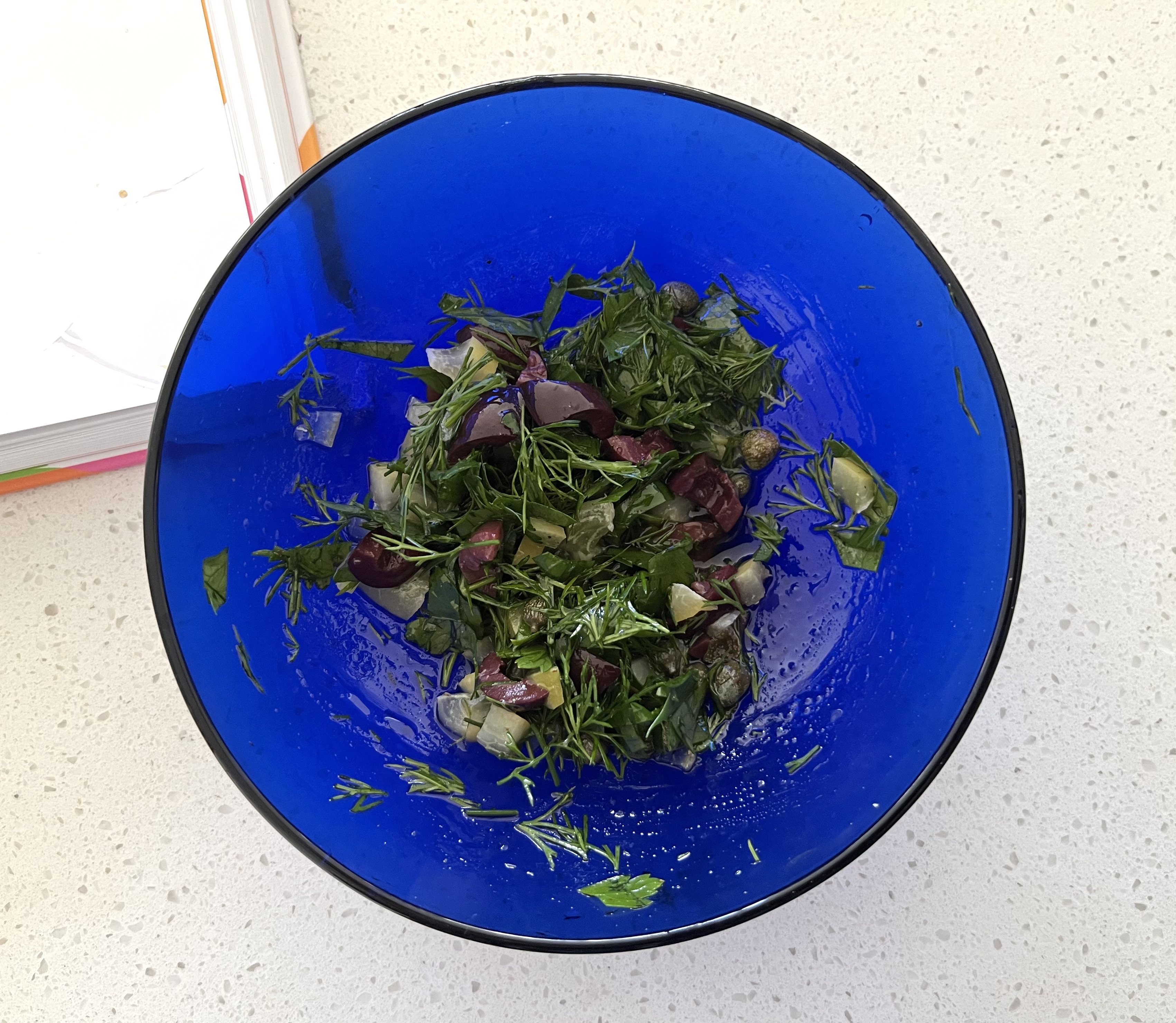 While the salmon is baking, make the salsa from chopped olives (I had black ones on hand), capers, preserved lemon, basil, parsley, olive oil and lemon juice. Spoon half the salsa over the salmon and serve the fish warm with the rest of the salsa in a bowl on the side. We also had potatoes.