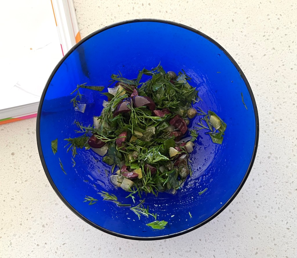 So I took a sideways look at the ‘problem’ and thought I always like to eat fish and seafood when on holiday or away somewhere so let’s start there. Then I considered what I might miss when away, and what will I do for comfort food on a snowy day in Hamburg (yes dear reader, there is some of the dreaded white stuff there still). Finally, I looked at what ingredients I had lying around and spotted nice crisp fresh green beans and tomatoes. So combining comfort, fish and seasonal produce I made the puttanesca-style salmon traybake from Ottolenghi’s Comfort. A bit of a stretch from the theme but hope you see my reasoning.