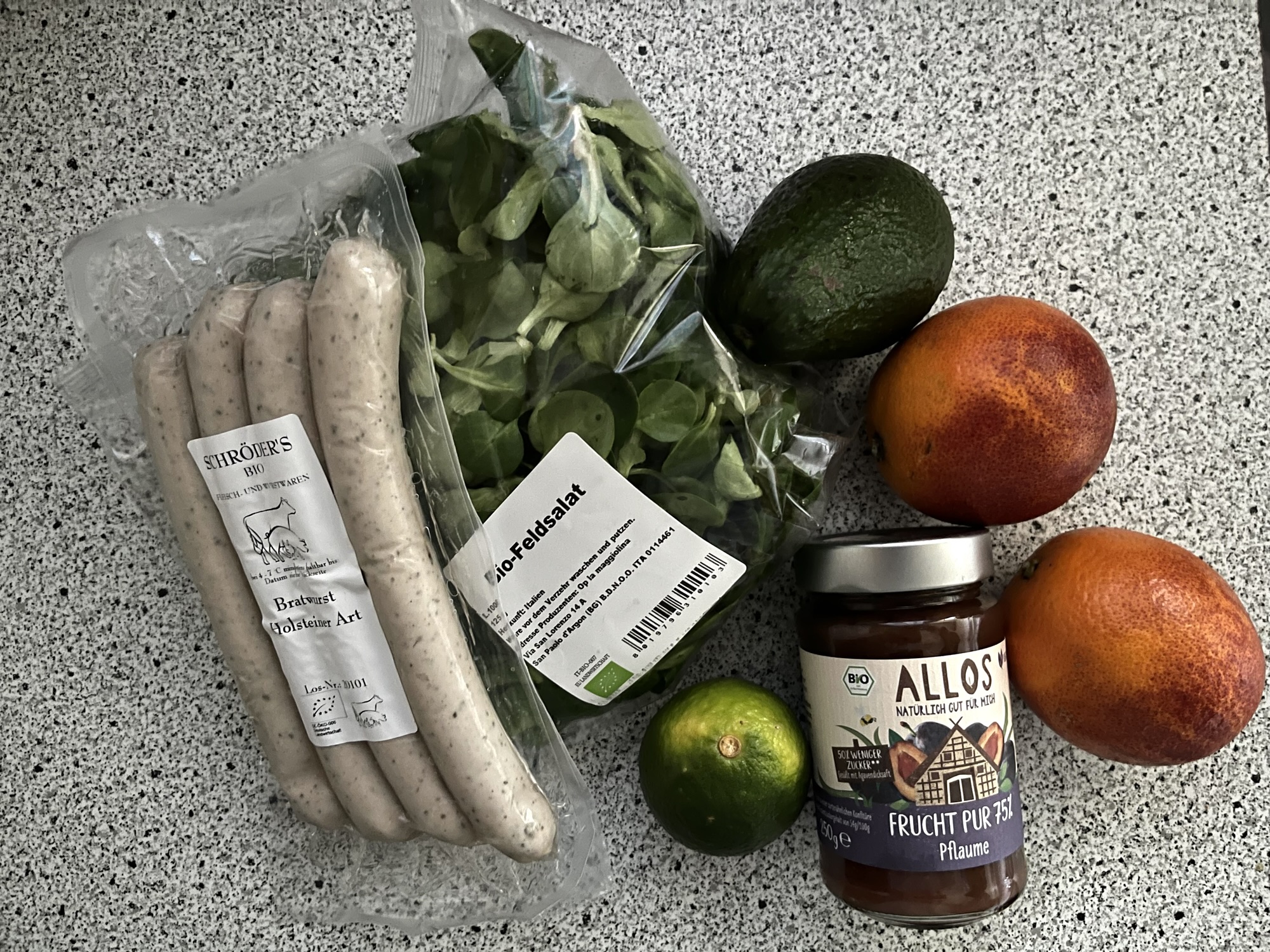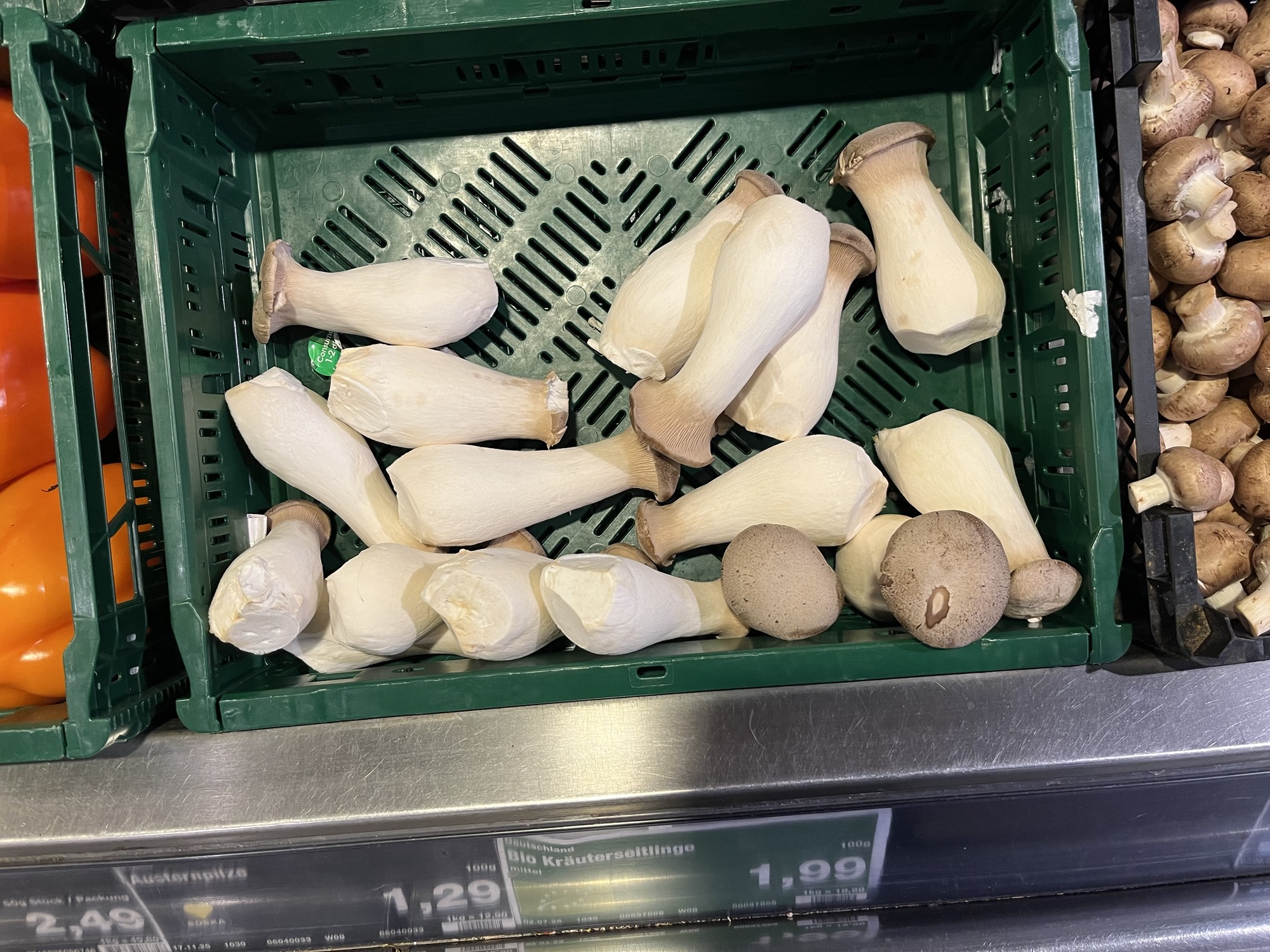 I did buy an avocado, two blood oranges and a lime however, and also visited what I call the local wholefoods store. Why do these places always smell the same, regardless of the city? That warm, herby smell is so distinctive. Anyway, I bought some sausages there, which turned out to be delicious, some lamb’s lettuce, a jar of plumb jam and some potatoes. On Saturday in the supermarket I will be using now we have figured things out, I spotted these trumpet mushrooms which I have never seen for sale like this before.