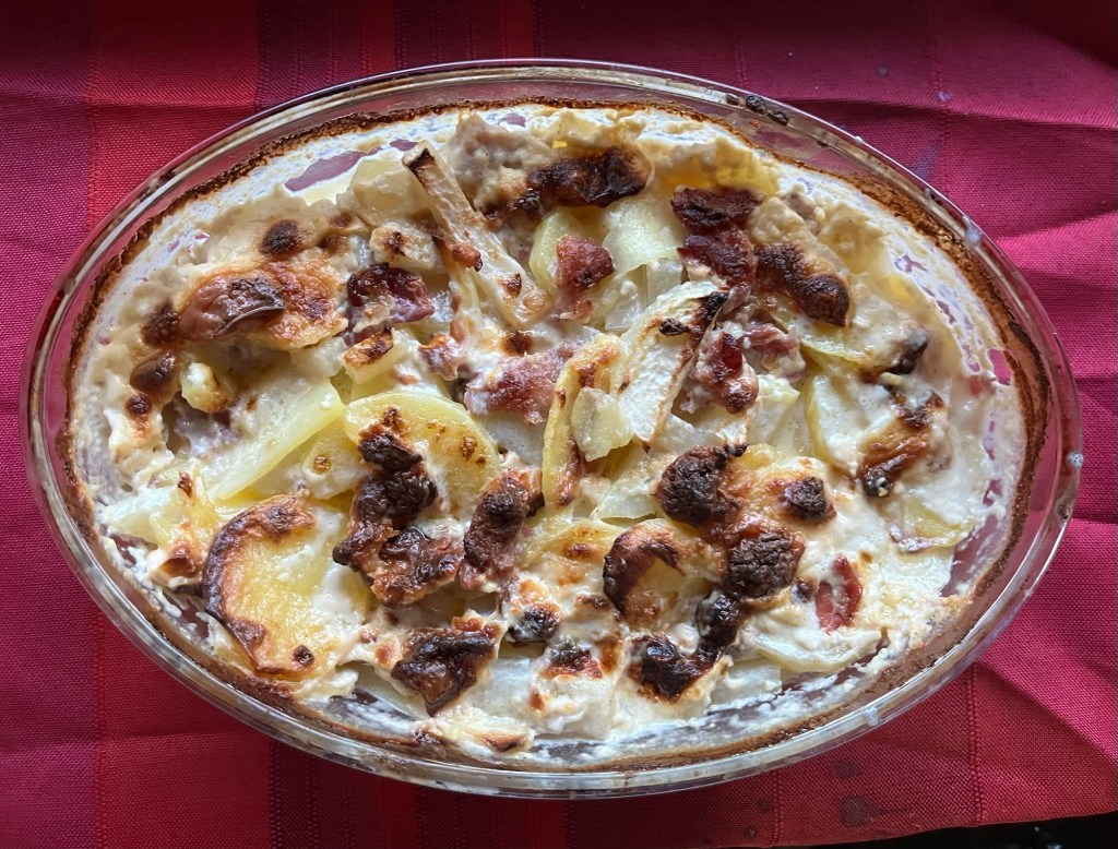 I cut the recipe in half, as I was making it for just the two of us. Heat up the oven to 180C (160C fan). Mix together the cream cheese (200g in the recipe, I use 100g – same applies throughout), 250g cream and 50 ml water and pour into a gratin dish. Add seasoning – nutmeg, paprika, salt and pepper.