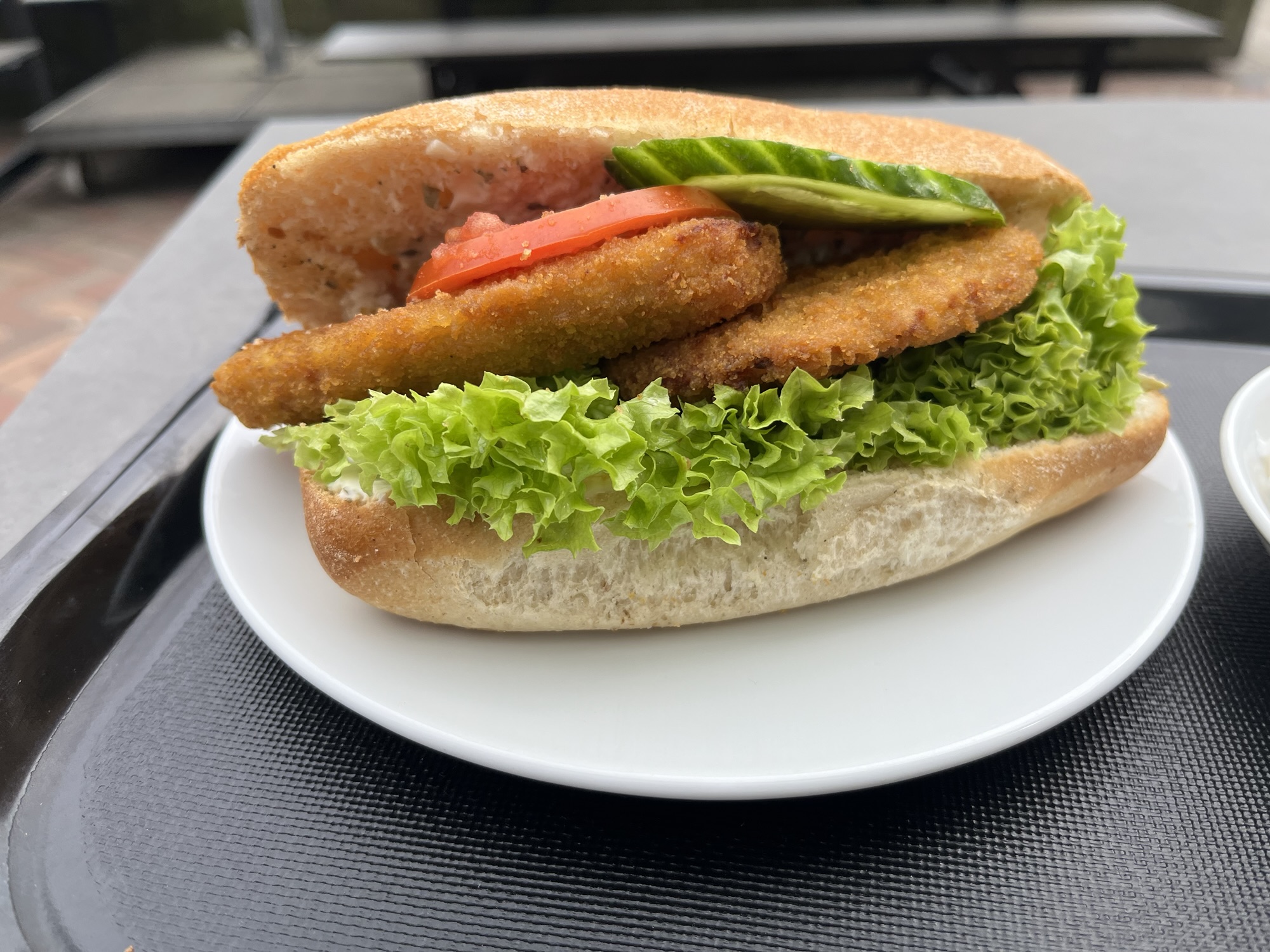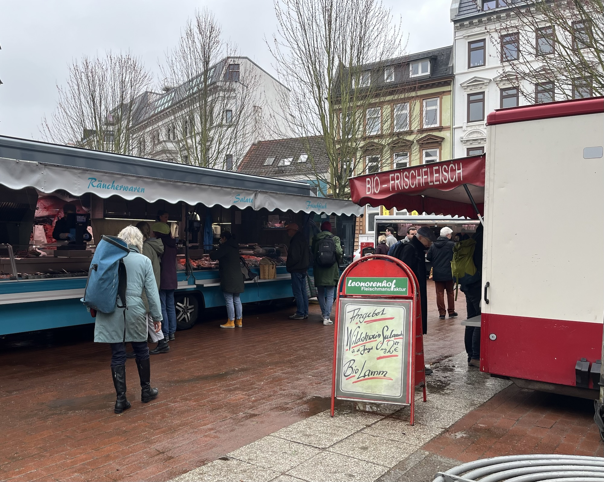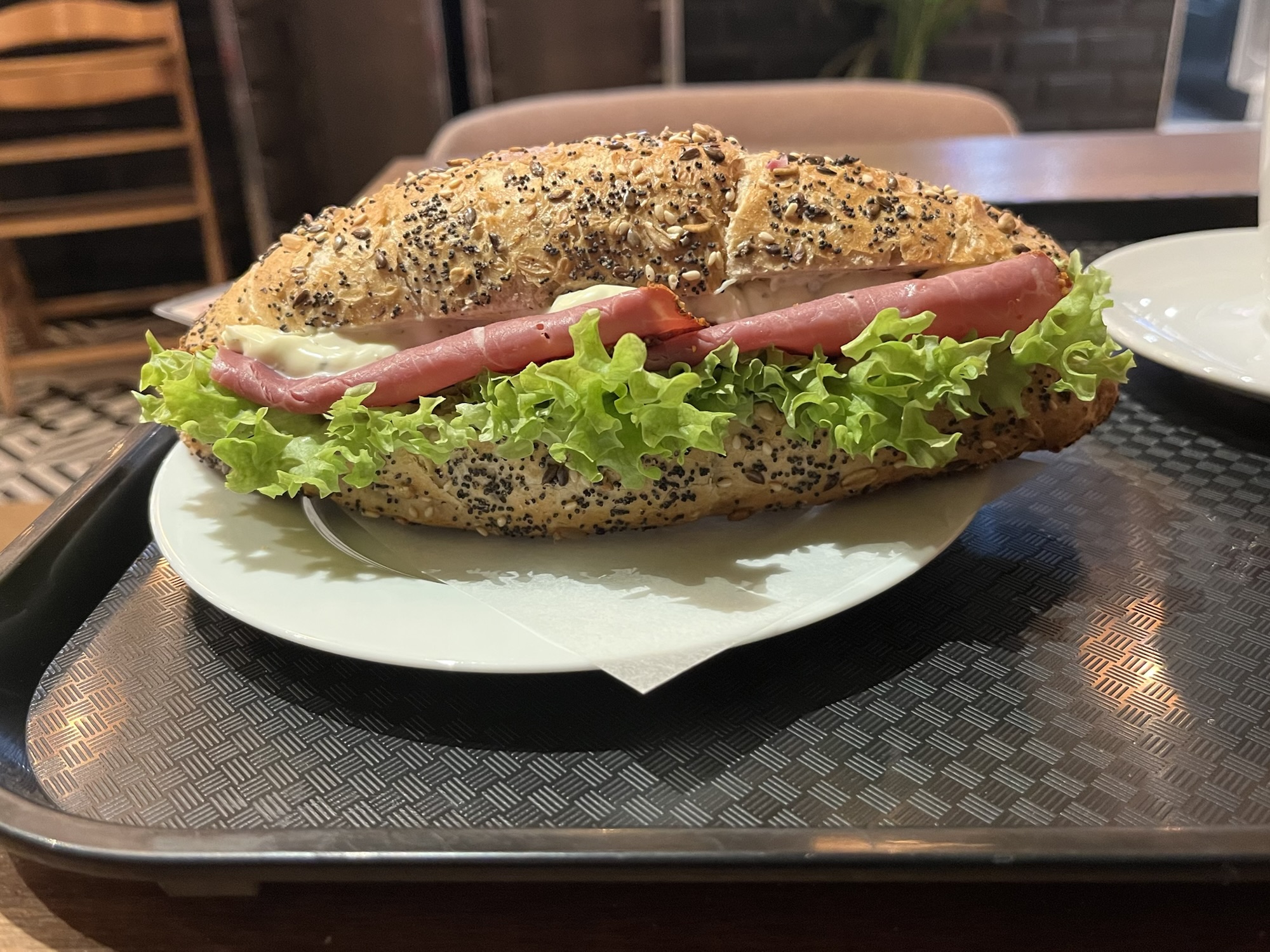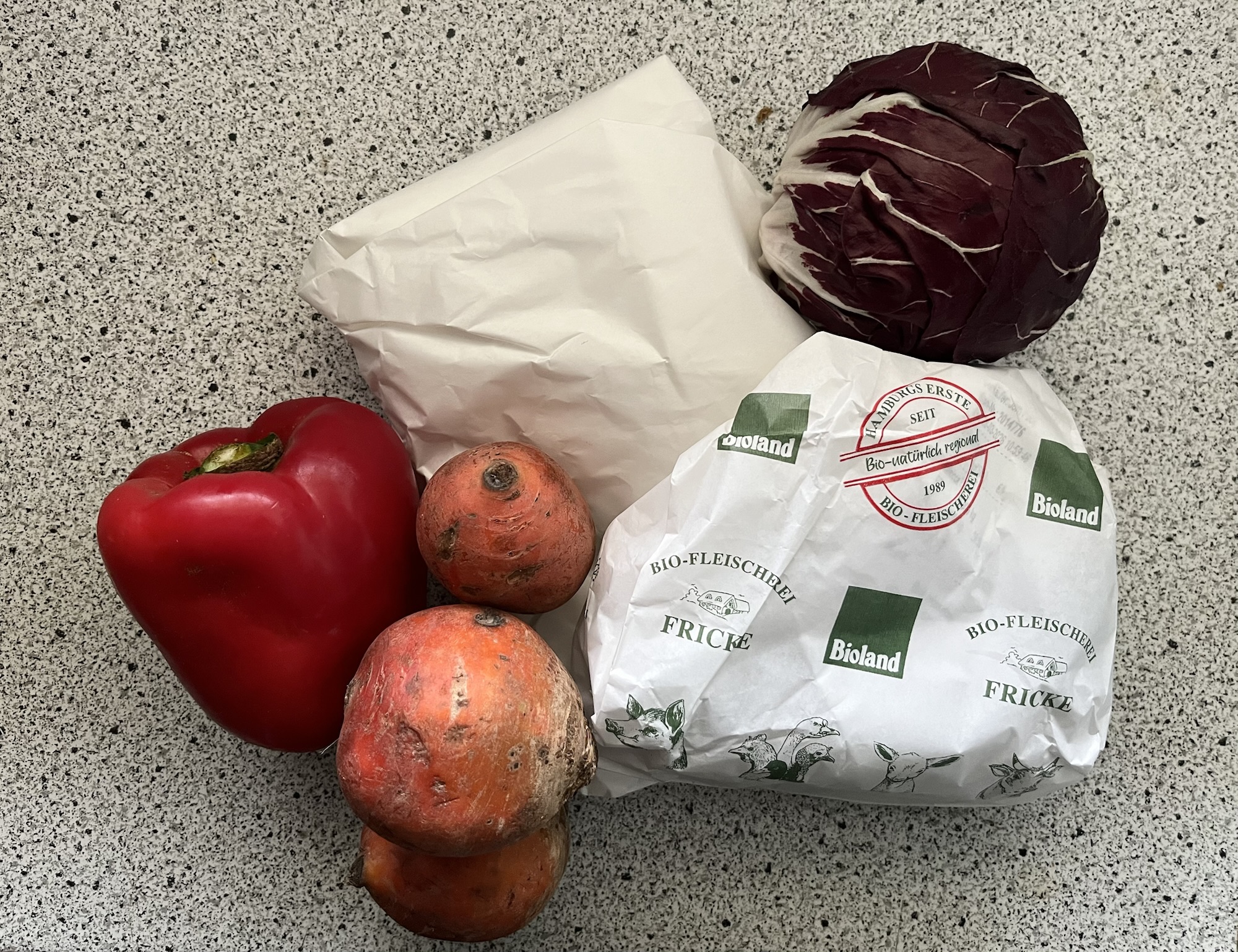 I had a couple of lunch sandwiches out – a very good one with beef, salad and an excellent dressing and an OK one with turkey that was tasty but just a bit overwhelming. We went to the market in Ottensen on Saturday, where we picked up some very good if a little expensive salmon which we had for Saturday night’s dinner, some sausages, and a few veggies – a radiccio, large red capsicum and some golden beetroot (which I will roast for a lunch). I also got some lamb’s lettuce, some lovely crackers and a piece of cheese called Schwarzer Peter which turned out to be a mild, slightly sweet cheese. Being in Europe, means we are missing feijoa season, but I did spot physalis in the supermarket, something you don’t get in New Zealand, so I have been enjoying them.