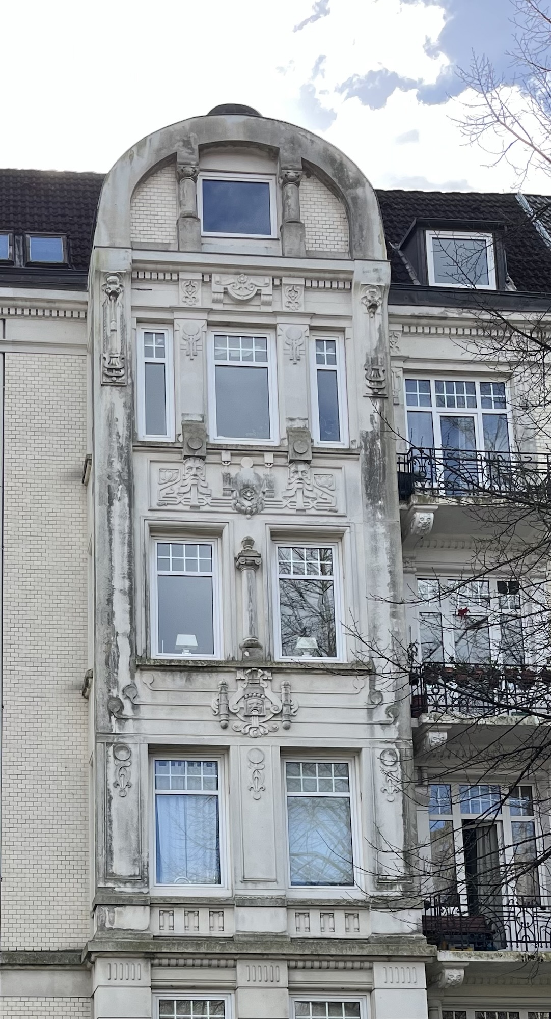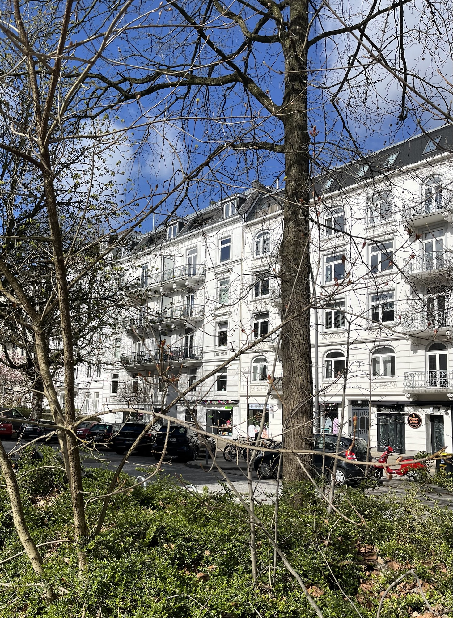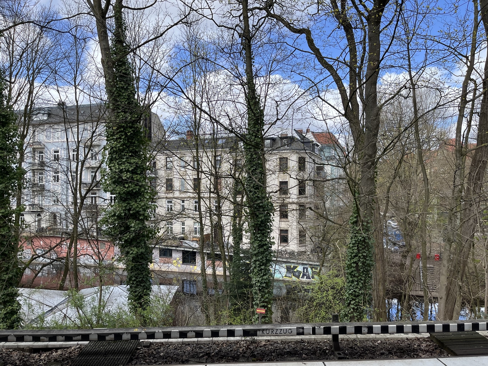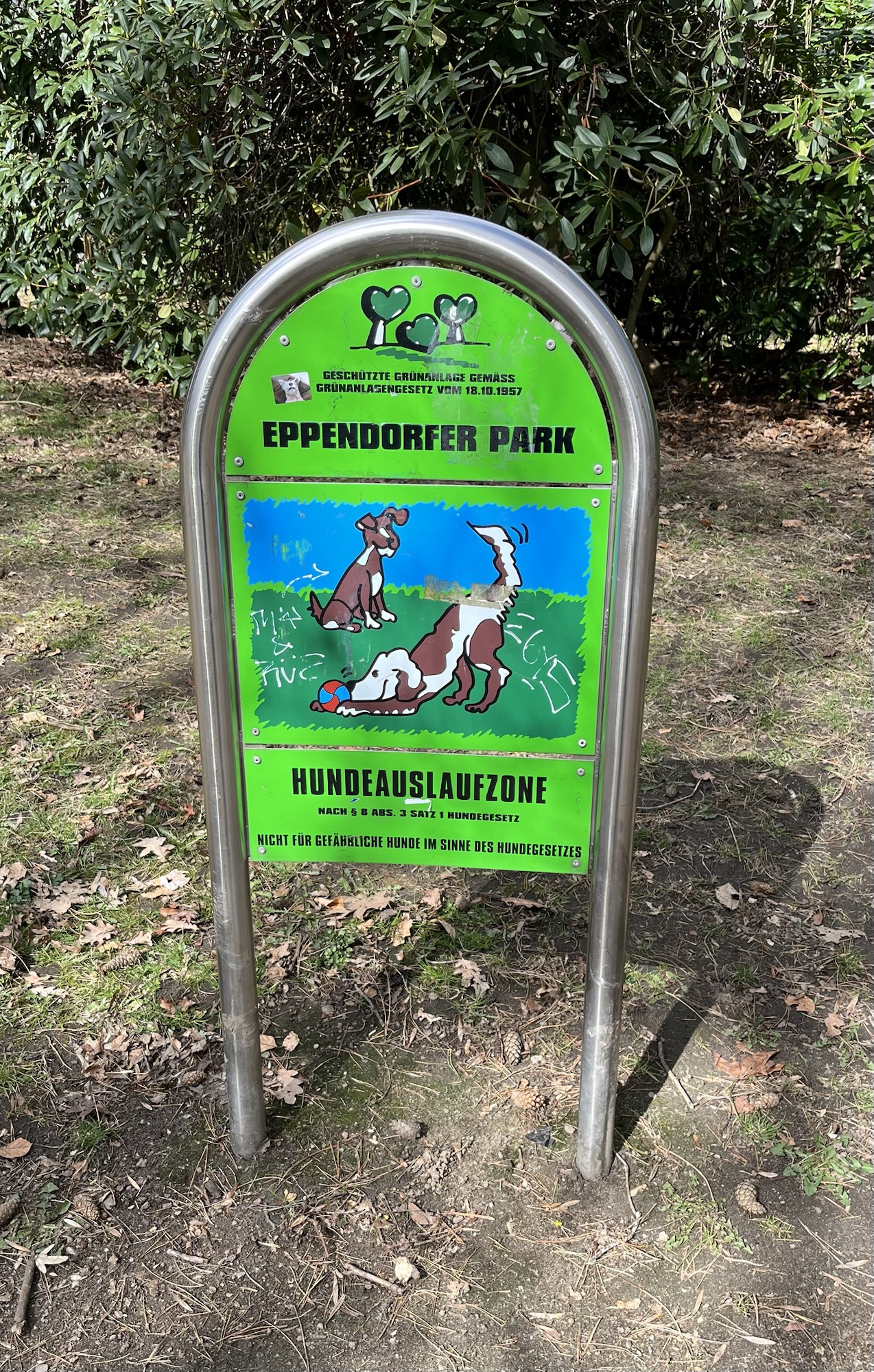 Sunday turned out to be a sunny day, so we got on the S and U trains and headed to Eppendorf, known for houses along the river and some rather nice looking shops. We had excellent toasted sandwiches for lunch – mine was a sort of three cheese with fresh thyme which was delicious if rich. Karl stuck with ham and cheese. We took a walk to the park, noting the stunning cherry blossom tree and this fun sign for a dog park. The middle of the three vertical pictures below was actually taken from the station platform, and I spotted more interesting faces on the building bottom right.