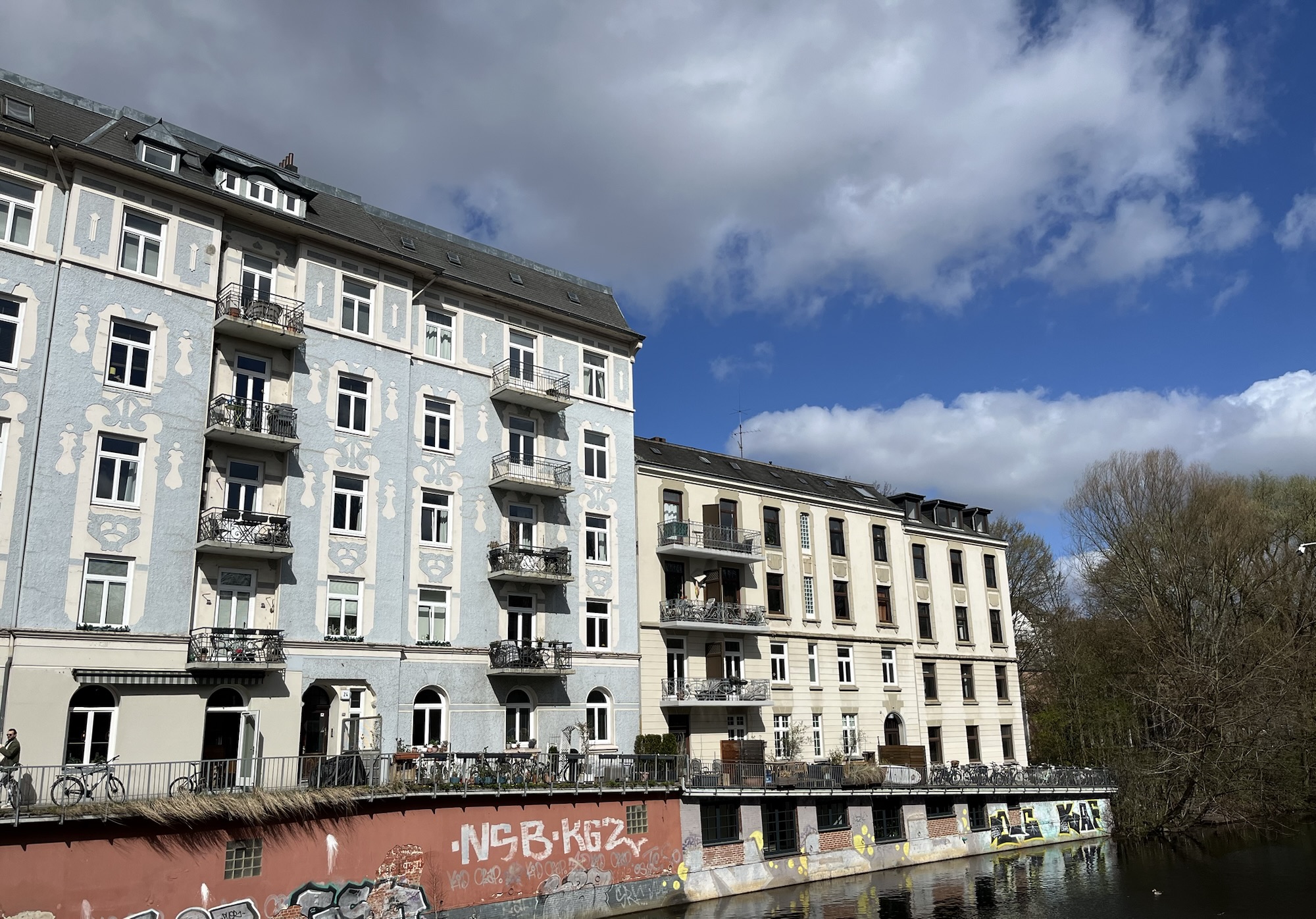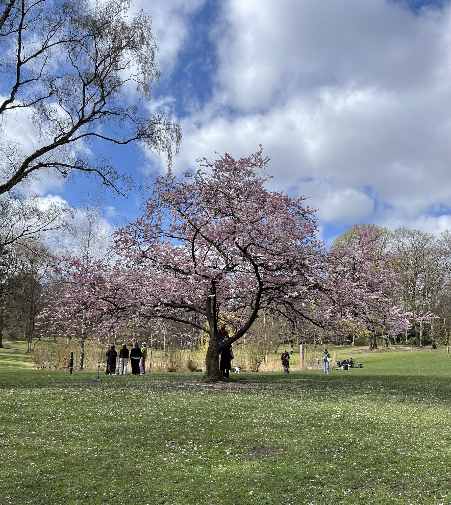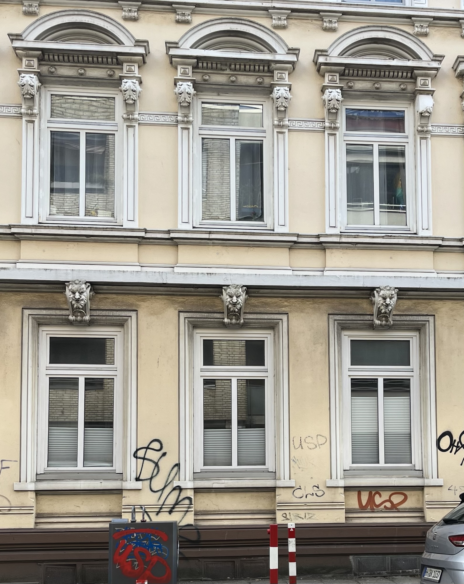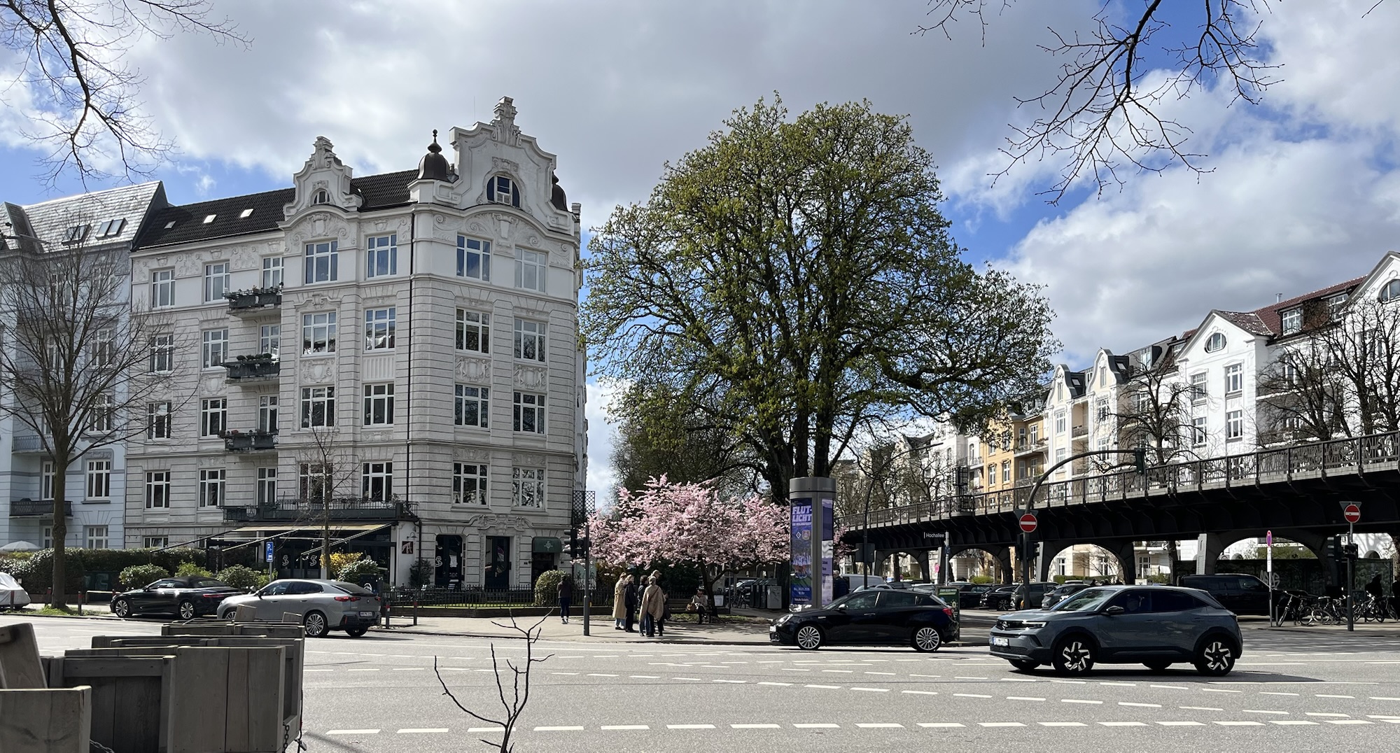 Sunday turned out to be a sunny day, so we got on the S and U trains and headed to Eppendorf, known for houses along the river and some rather nice looking shops. We had excellent toasted sandwiches for lunch – mine was a sort of three cheese with fresh thyme which was delicious if rich. Karl stuck with ham and cheese. We took a walk to the park, noting the stunning cherry blossom tree and this fun sign for a dog park. The middle of the three vertical pictures below was actually taken from the station platform, and I spotted more interesting faces on the building bottom right.