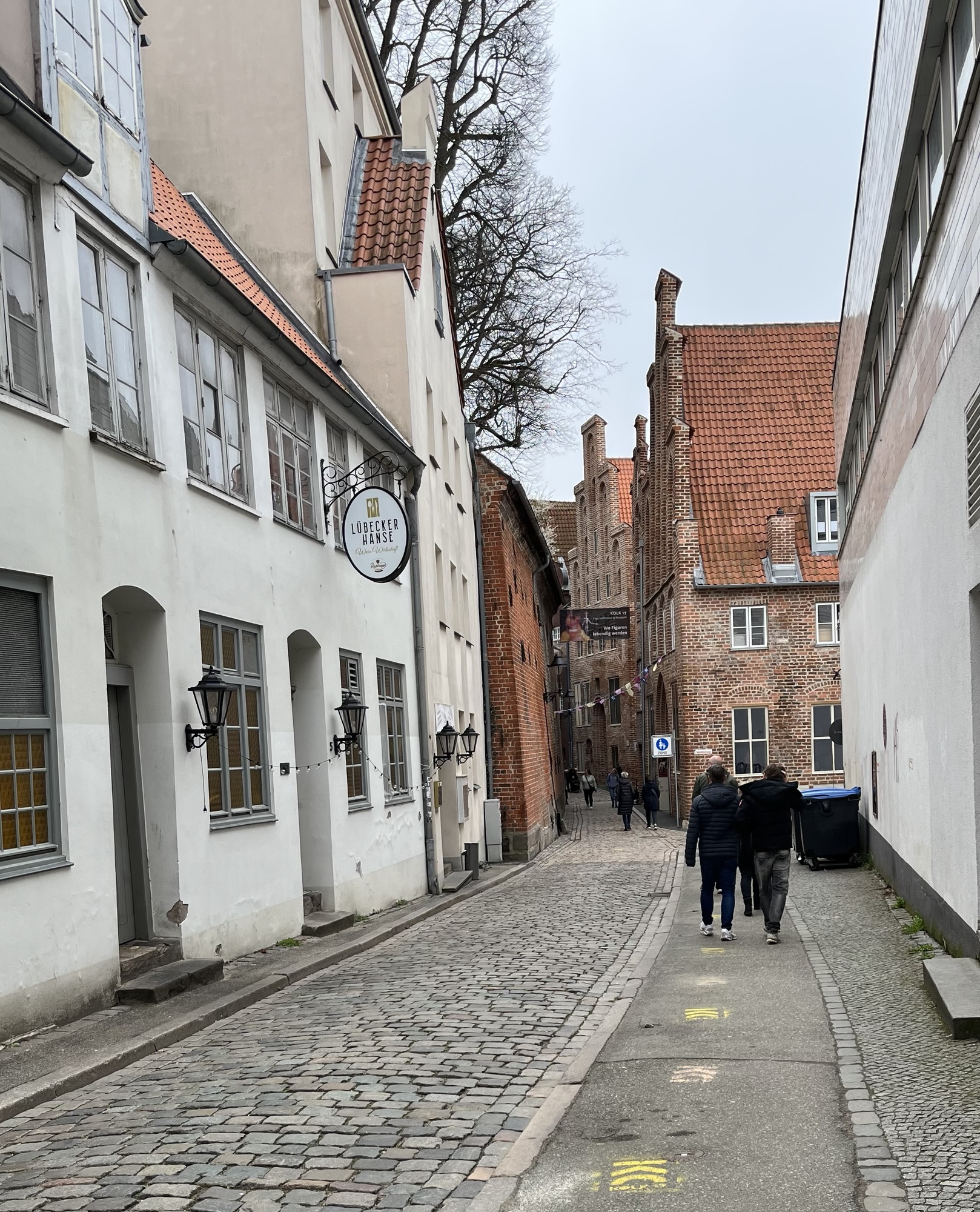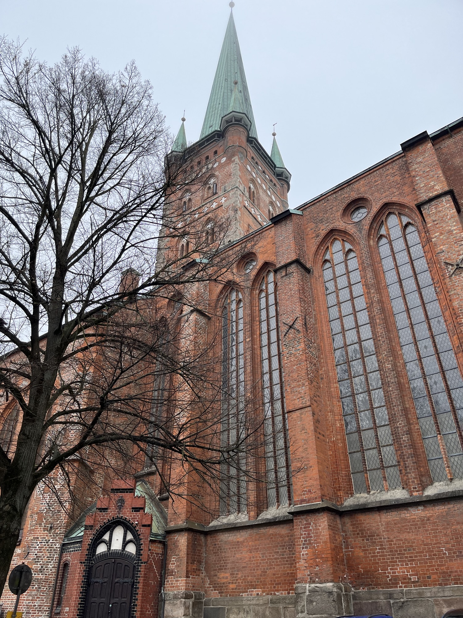 The city actually lies on an island, on the mouth of the Trave river, and the old town has been a UNESCO World Heritage Site since 1987. When we arrived, it was cold and a bit misty, but as you’ll see in part 2, the weather rapidly changed. The first thing you see is the Holsten Gate, Lübeck’s famous landmark, which actually appears on the German 2 euro coin. If you think your eyes are playing tricks, yes the right hand tower is leaning over, something that has been noted apparently since it was built in the late 15th century. Restoration has been carried out so it is unlikely to fall over, but there are a few other buildings, such as the skinny one in the row of buildings below, that also list at some angle.