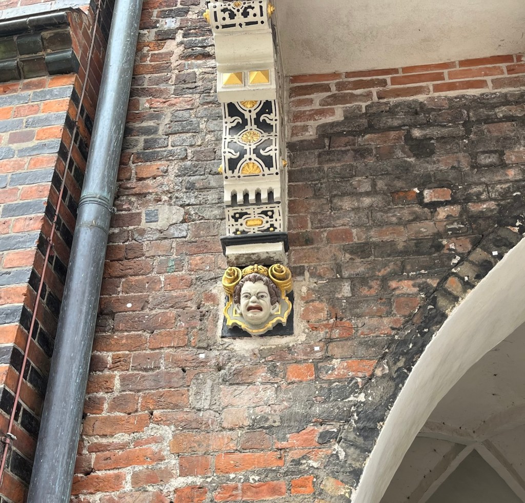 We headed off down the first interesting looking street, and finally ended up at the Radhaus or Town Hall. Construction began in 1230, but of course time and rebuilding has had an impact on it structure and shape. I of course focused on the faces above one of the entranceways – these were such fun and take pride of place in my collection!