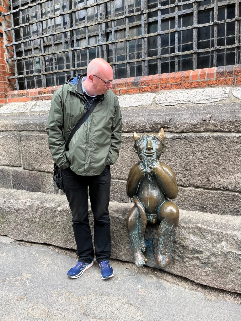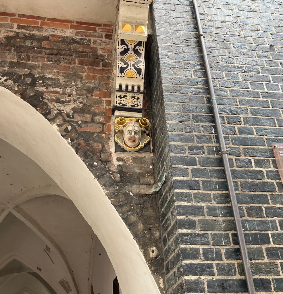We stopped by St Peter’s Church, but it looked like they were getting the building ready for the Easter weekend so we wandered over to St Mary’s Cathedral (St Marien zu Lübeck). Outside the church is this little devil, sitting on the wall. The story goes that when the church was first being built, the devil believed it was going to be a bar where people could drink wine. He thought this a great idea, so began to mingle with the workers and help out. One day he realised what the building was going to be so he grabbed a huge boulder to smash the walls that had already been built. Just as he was about to throw the stone a man shouted (and here I quote from the notice beside the statue) “Just stop it Mr Devil! Leave what has already been erected! For you we will build a wine bar just here in the neighbourhood!” The devil was of course very pleased with this and opposite the workers build the wine cellar of the town hall. Such a great story!