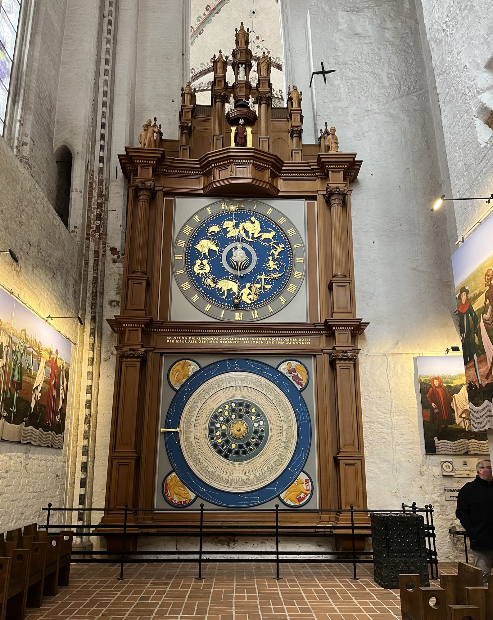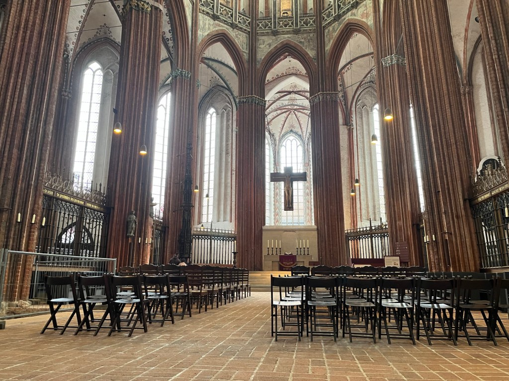 Anyway, the diocese of Lübeck was founded in 1160, and construction of the three-aisled brick cathedral began in 1173. However, during the air raid on Lübeck in 1942, the building was completely destroyed by fire, and its vaults collapsed. Reconstruction did not begin until 1960 and in 1973, Lübeck Cathedral was re-consecrated. The cathedral houses numerous artistic treasures, including the 17-meter-high Triumph Cross, the carved pulpit, and the Lettner clock. Below you can see the memorial in memory of 1942, with what remained of the bells, the astronomical clock and the cross.