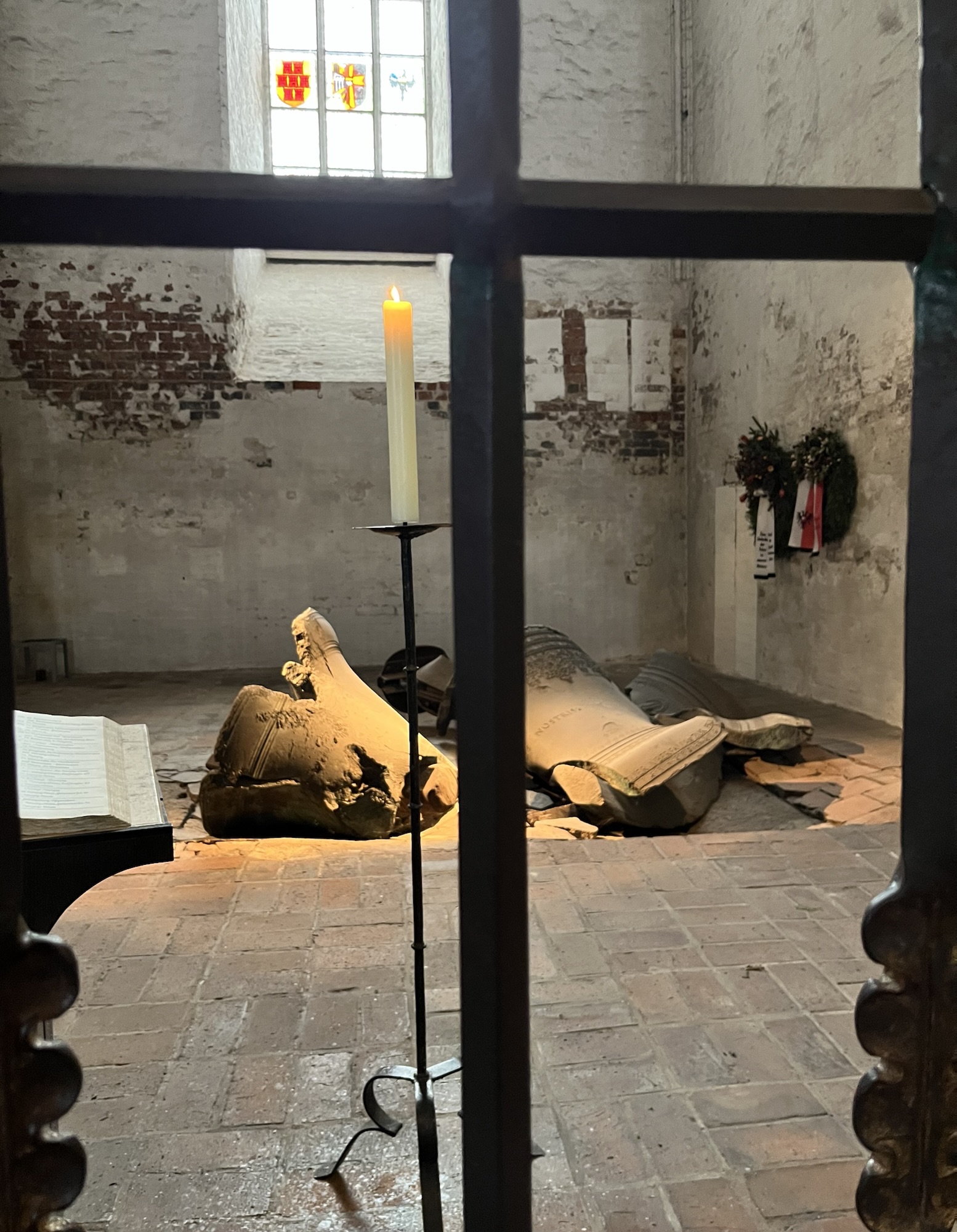 Next to the clock are a couple of stained glass windows, that I did not get a good picture of, designed to commemorate the 1463 depiction of Lübeck’s dance of death, probably ordered after one of the waves of plague. The original work was lost during the 1942 bombing, though luckily some photographs of the work remain. You canjust see a reconstruction of part of the work next to the clock. The renovations uncovered some historical artifacts and structures, some of which are on display, and work carries on today, as you can see if you notice the fencing in the picture above.